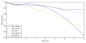 This plot shows that as the simulation runs, the cloud begins to lose mass (as the variable ‘Mass Fraction’ decreases with time). However, for the runs with aligned magnetic fields (blue), meaning that the magnetic fields are pointing in the same direction as the wind is flowing, the clouds don’t lose as much mass as when the fields are perpendicular to the wind (transverse, orange). This is interesting because we actually would expect it to the the opposite! Transverse winds would seem to protect the cloud from getting destroyed as they would wrap around the cloud like a blanket as the wind rushes by, but it looks like they don’t! Then, comparing the blue and orange to the black line, we can see that either way, having magnetic fields does make the cloud loose less mass than if there are no magnetic fields (in the hydro only run). Side Note: One of those lines is super short (the dashed orange one) because I haven’t finished that simulation yet so I don’t have all the data!